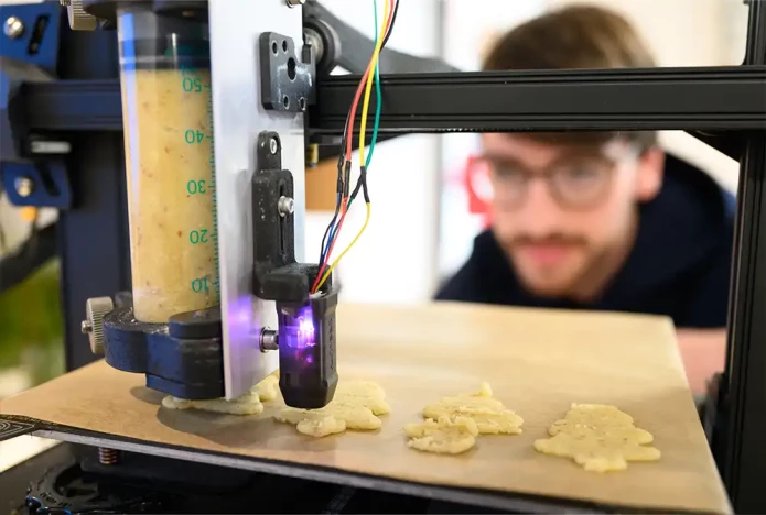 Cookies being produced using a mobile 3D printer at TU Bergakademie Freiberg, Germany. Photos by Robert Michael via Getty.
