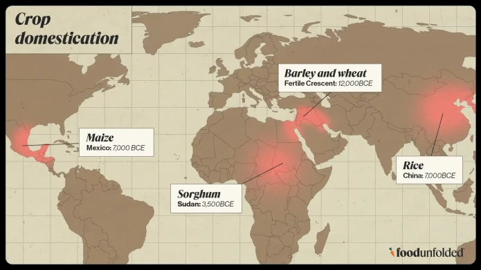 The Fertile Crescent, often called the cradle of civilisation, sits in the eastern Mediterranean and is widely regarded as the birthplace of agriculture. Experts believe agriculture emerged here around 12,000 BCE, where early farmers domesticated cereal crops like barley and wheat, transforming from nomadic societies into settled farming communities. Early farmers domesticated maize from the wild grass teosinte in South and Central America. This attention to pollination helped sustain complex civilisations like the Aztecs. Meanwhile, in Africa, tubers provided year-round sustenance and rice farming thrived along the Yellow River in China, enabling permanent settlements.5