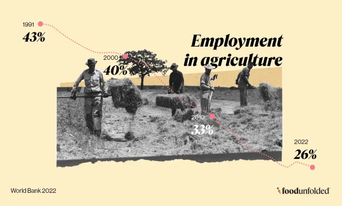 Today, our entire food chain has reached a critical point, and we need to take transformative action to improve food security. Our food production significantly contributes to climate change, biodiversity loss, resource depletion, and air, water, and soil pollution.17 At the same time, people are increasingly not getting the right nutrition - either from too few calories, or too many calories coming from the wrong types of food. And while many people struggle to access healthy food, data shows that we waste about a third of the food we produce. Moreover, recent economic and technological advancements have led to a stark decline in the farming community worldwide. In Europe, just 4.5% of the population works in agriculture.18