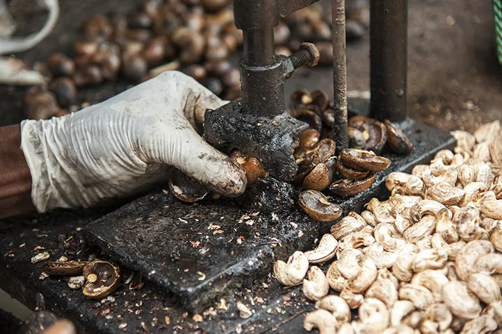 El paso más difícil en el tratamiento de los anacardos es la extracción de la nuez (con forma de haba) de su cáscara; lo anterior implica un trabajo intenso que requiere mano de obra especializada. El 90% de esta mano de obra son mujeres, quienes reciben salarios insignificantes. Cuando la cáscara se abre, rezuma un aceite denominado CNSL, o 'líquido de cáscara de anacardo', el cual es altamente corrosivo. Este aceite, cuando entra en contacto con la piel, provoca quemaduras y llagas que a menudo presentan riesgos para la salud de los trabajadores.9