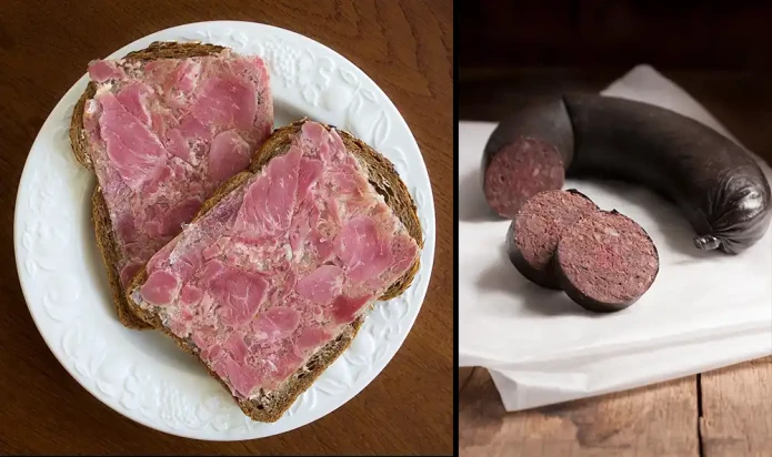Left: hoofdkaas, a Dutch delicacy made from a pig’s head, tail and ears. Right: verivorst, the national dish of Estonia. A Sausage made from pork, pig's blood, barley groats, and marjoram, and is a traditional Christmas and winter food.