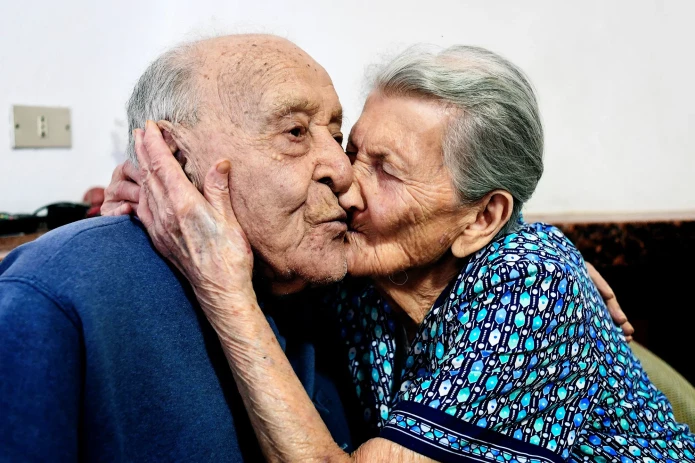 Antonio Vassallo, 100 years-old, and his wife Amina Fedollo, 93, pose in their house in Acciaroli, southern Italy. Their town is renowned for its low rates of heart disease and Alzheimer's, and has a disproportionately high number of centenarians in its population of about 2,000. Photo by Salvatore Laporta via Getty Images.