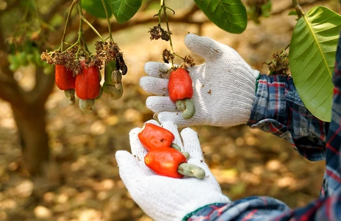 Cashew nuts come from fruit-producing trees. The fruit, or ‘cashew apple’, which resembles a bell pepper, is a ‘false fruit’. A master of deception, the real fruit dangles from the bottom of the cashew apple, guarding within it a single seed known to us as a cashew nut.1