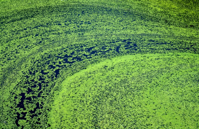 During an algae bloom, cyanobacteria, commonly known as blue-green algae, develop at the surface of the water and prevent access to light and oxygen for other organisms.