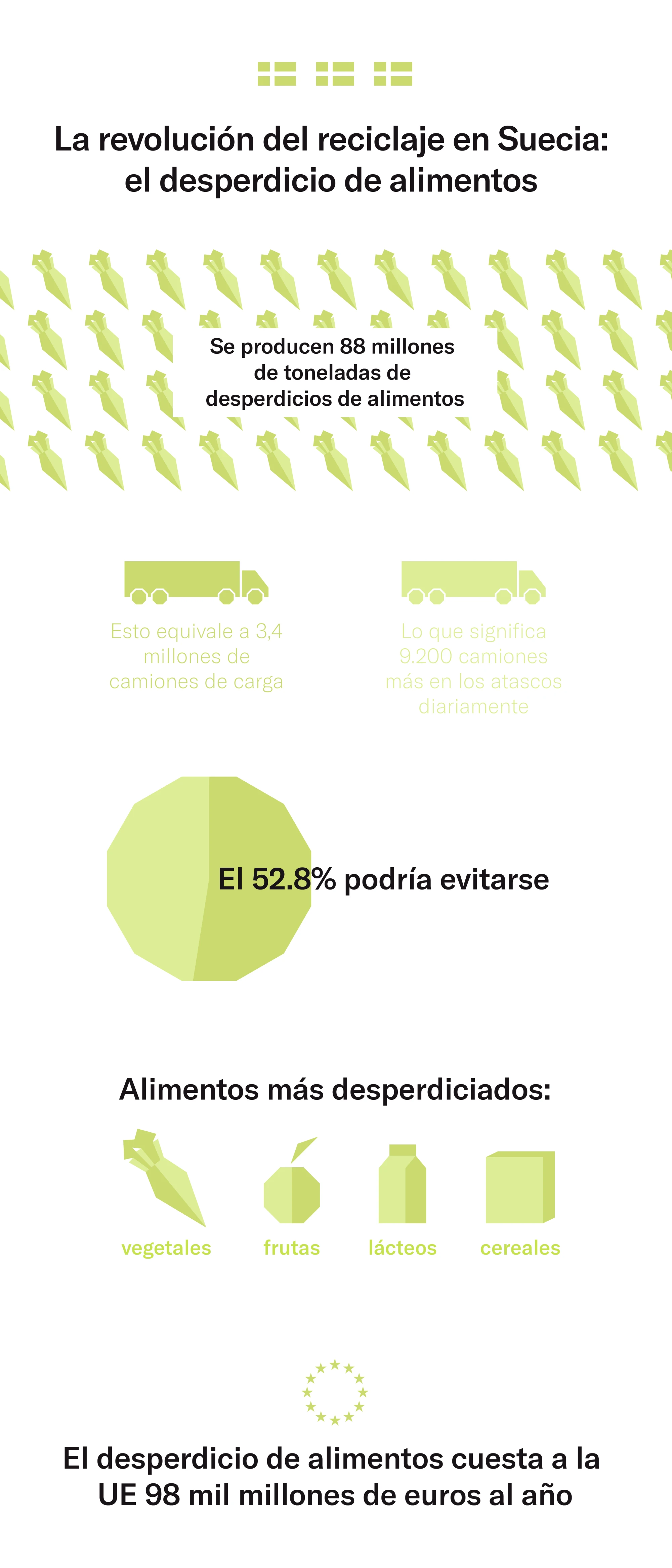 La energía producida a partir del desperdicio de alimentos ha ayudado a suministrar energía a más de 250.000 hogares suecos y aproximadamente al 20% de la calefacción urbana.5 En los próximos años, Suecia seguirá mejorando la eficiencia de sus recursos.