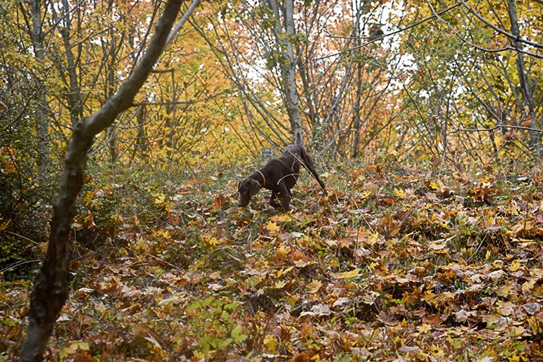 Las trufas deben recolectarse (ser encontradas) debajo del suelo. Tradicionalmente, esto se hacía con la ayuda de los cerdos. La hembra del cerdo se siente atraída por el aroma de las trufas, porque estas segregan androstenol, que es una hormona sexual que también se encuentra en la saliva de los cerdos machos. Sin embargo, es increíblemente difícil convencer a las hembras de que no se coman la trufa después de trabajar duro para localizarla. Los perros, por otro lado, también son buenos olfateadores y se conformarán con otro tipo de recompensa. Por lo tanto, los cazadores de trufas de hoy prefieren usar perros entrenados para la búsqueda de este alimento.