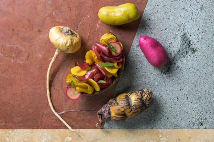 Right: Pia Leòn and Virgilio Martínez, chefs at Lima's Central Restaurant, Peru. Right: León's dish of Peruvian tubers. Photos via Central and 50 Best.