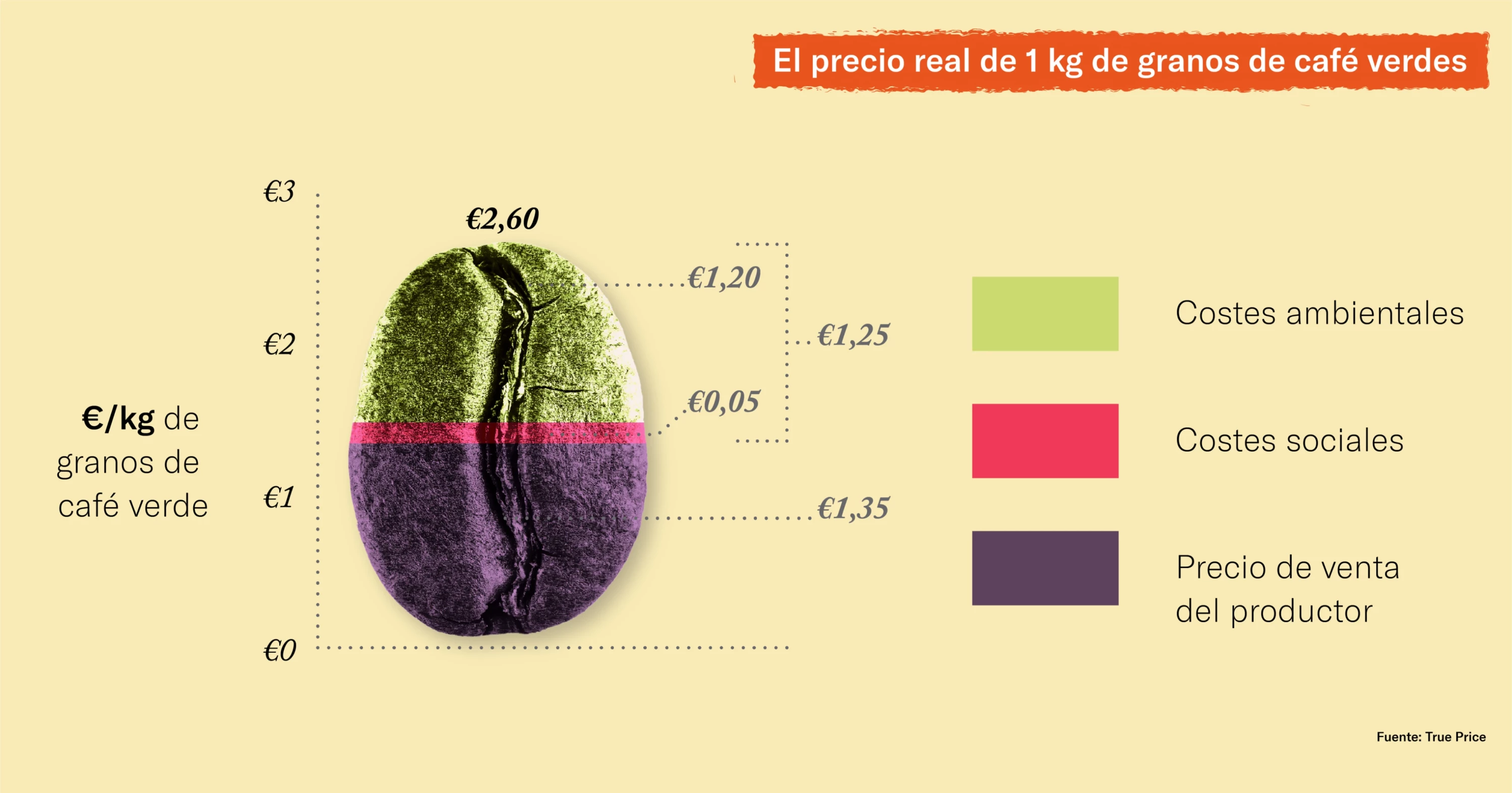 Los investigadores alemanes no son los primeros en realizar estos cálculos; científicos de diversas disciplinas están buscando formas de proporcionar información sobre los costes externos. La organización holandesa True Price ha estado trabajando en el cálculo del coste real de los productos desde 2012, y ahora es el líder mundial en métodos y herramientas para medir y monetizar el impacto social. Junto con la Iniciativa de Comercio Sostenible (IDH), True Price publicó cuatro estudios sobre el precio real del café, el cacao, el algodón y el té con una lista clara de 14 tipos de costes externos divididos entre costes ambientales y sociales.5