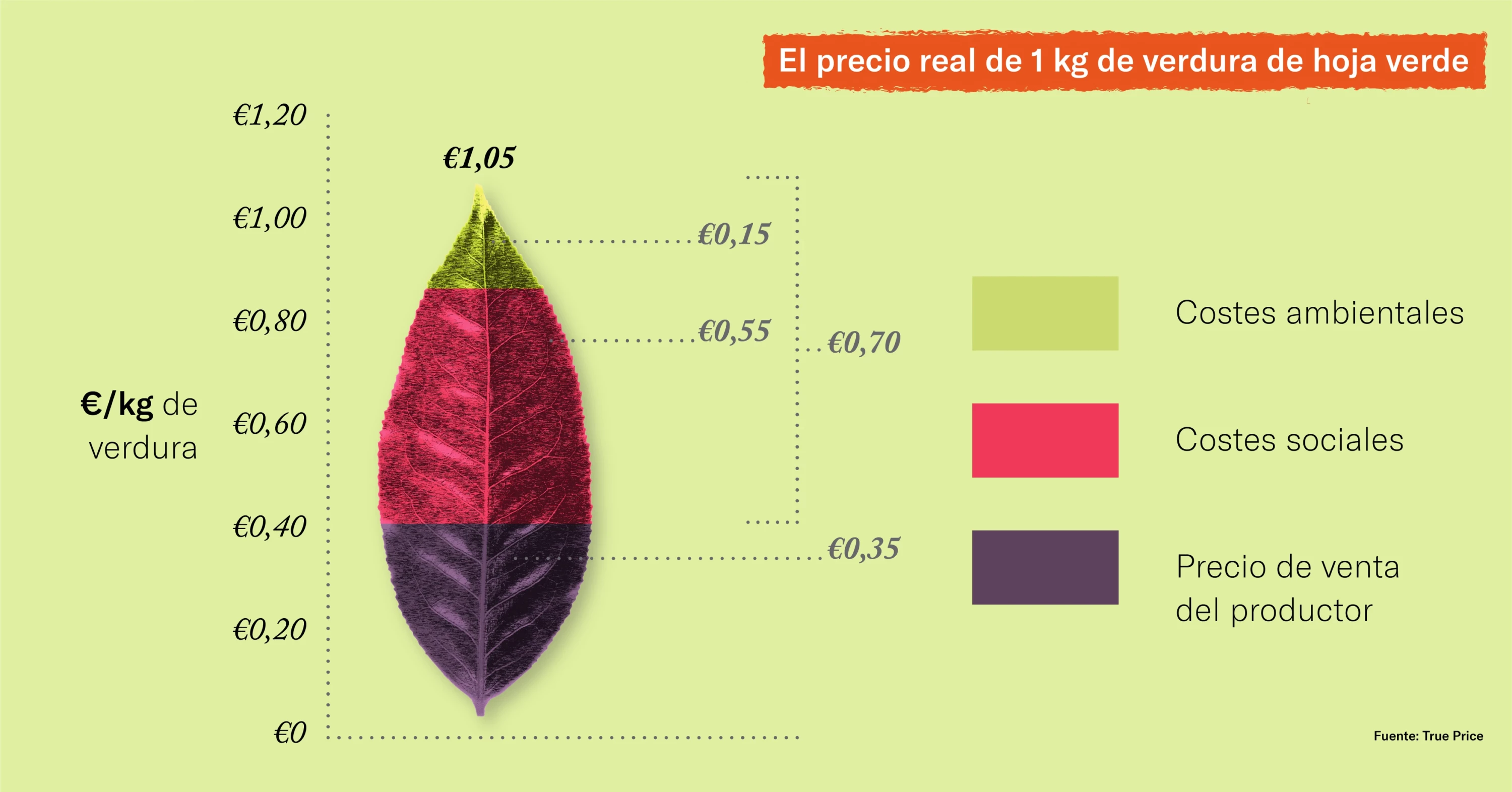 Para comparar el precio de venta al público al coste real de los productos, hay dos conceptos importantes que podemos utilizar. Primero, el 'precio de venta del productor', que significa el precio del producto disponible en la granja, excluyendo cualquier coste facturado por separado debido al transporte o entrega.3 Luego, están los 'costes externos' de la producción del alimento, también llamados 'brecha de precio real', que se refieren a los costes generados de las actividades económicas que no se reflejan en el precio de venta del productor. Los costes externos también pueden clasificarse como costes ambientales si tienen un impacto directo sobre el medio ambiente y como costes sociales si tienen un impacto directo sobre el bienestar de las personas.4