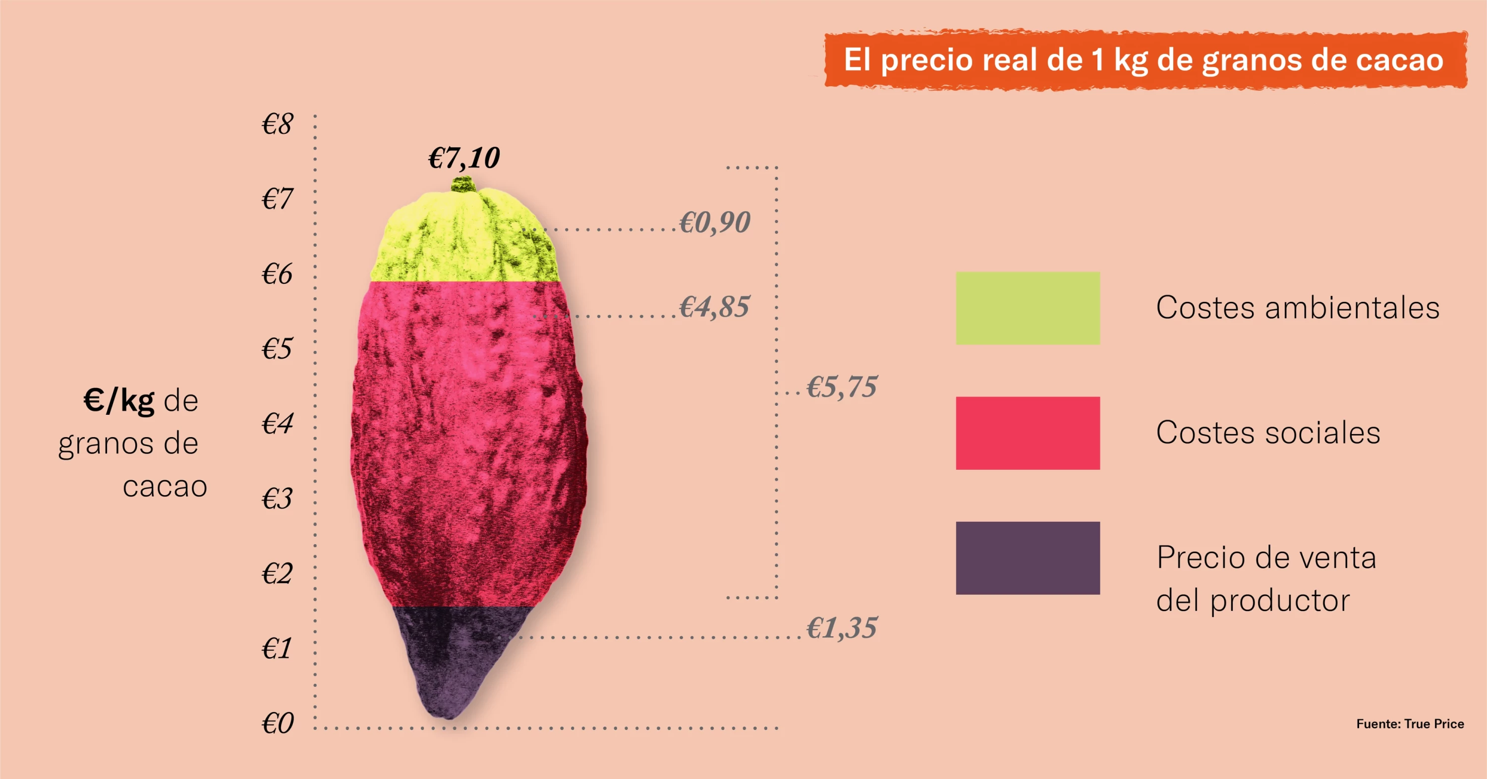Al observar más de cerca el cacao de Costa de Marfil, el coste real de los granos de cacao convencionales es de 7,10 €/kg de cacao en grano. Esta es la suma del precio de venta del productor (1,35 €/kg de cacao en grano) y los costes externos del cultivo, o la diferencia de precios real (5,75 €/kg de cacao en grano). La verdadera brecha de precio es más de cuatro veces mayor que el precio de venta del productor de los granos de cacao. Esto demuestra que en la granja existen costes ocultos sustanciales en relación con el precio de mercado.