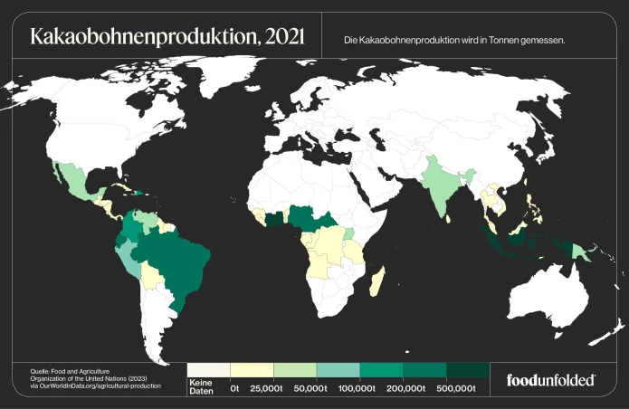 Deutschland bezieht die größte Menge Rohkakao, also die Schokoladenbasis, von der Elfenbeinküste in Westafrika. 2022 waren es über 300.000 Tonnen, was 66% der gesamten Importmenge entspricht. Der Rest verteilt sich mit 14% auf Ghana, gefolgt von Nigeria mit 8%, Ecuador mit 5% und sonstige Länder wie Peru oder die Dominikanische Republik3.