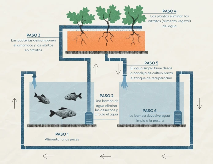 Están totalmente relacionados porque uno depende del otro. El agua donde están los peces alimenta las plantas y los vegetales limpian el agua, esto forma un ciclo infinito totalmente autosuficiente y sostenible.