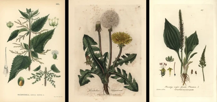 Wild European plants like nettles, dandelion, and wild plantain are all edible and high in fibre. Illustrations via Getty Images.