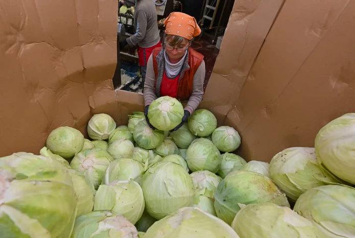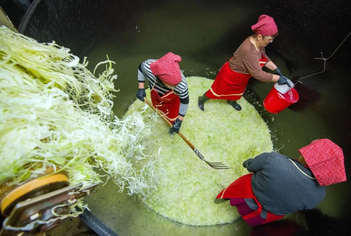 Sauerkraut made in the Spreewald region of Germany is known for its high-quality ingredients and traditional methods. The cut heads of white cabbage go into huge containers and are trampled down with the addition of salt and Kümme extract. After six to eight weeks, the finished sauerkraut can be bottled. Every year, the company processes about 750 tons of white cabbage, which is grown exclusively in Germany. Photo by Patrick Pleul via Getty Images.