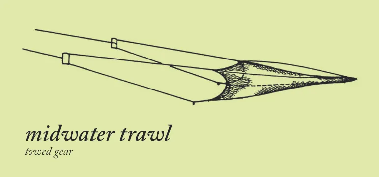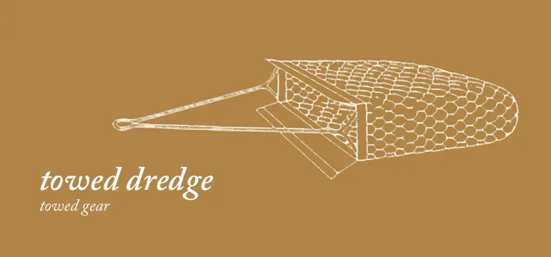 Towed gear literally drags a net “bag” across the bottom of the ocean floor. We typically call this gear trawls and dredges. These are used for capturing bottom-dwelling sea life (e.g. flatfish, mussels, and some cod species), which is why the net has to be in contact with the ocean floor. Essentially, fishermen are “towing” their catch.