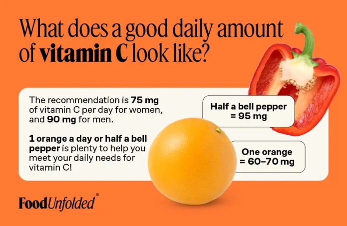 The recommendation is 75 mg of vitamin C per day for women, and 90 mg for men. 1 orange a day or half a bell pepper is plenty to help you meet your daily needs for vitamin C!