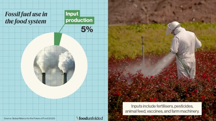 Today fertilisers and pesticides are a key part of the global food supply chain, but fossil fuels have also become entrenched in other stages, from packaging and transportation to manufacturing. Fossil fuel use in the food system can be divided into four main stages: Input production, land use and agricultural production, processing and packaging, and retail, consumption and waste.