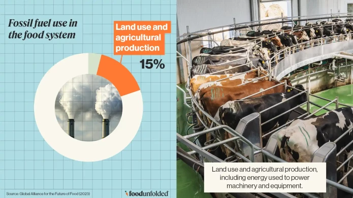 Land use and agricultural production, including energy used to power machinery and equipment, ventilation, greenhouse heating, fertiliser distribution systems, feed production, animal housing and drying the harvest, accounts for around 15% of fossil fuel (or energy) use in the food system.1