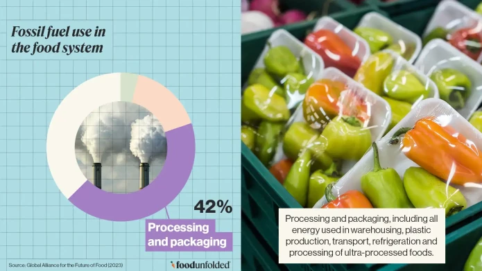 Processing and packaging, including all energy used in warehousing, plastic production, transport, refrigeration and processing of ultra-processed foods, accounts for around 42% of fossil fuel use in the food system.1 This stage is particularly energy-intensive due to its reliance on energy-intensive processes such as refrigeration systems, transport and packaging manufacturing. This is one area where fossil fuel use is expected to increase - as the food system becomes more globalised, products will travel further, need better packaging to keep them fresh and face stricter processing requirements, all of which are likely to require more fuel.2