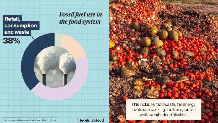 Retail, consumption and waste account for around 38% of fossil fuel use in the food system.1 This includes food waste, the energy involved in cooking and transport, as well as embedded plastics. In higher-income countries, the energy intensity of retail is particularly high due to the prevalence of refrigerated containers and factory-processed food.2 Similarly, as consumption patterns have shifted towards eating seasonal crops all year round, food supply chains have become longer, requiring more energy for transport, increasing emissions.
