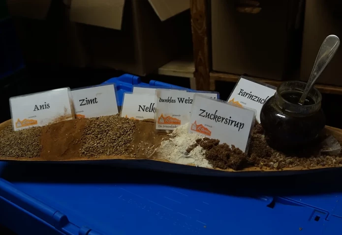 Im hinteren Teil der Backstube stehen große Töpfe, in denen Zuckerrübensirup erwärmt wird. Hat er 80 Grad erreicht, wird er in eine große Knetmaschine geschüttet. Dazu kommen die trockenen Zutaten. Ein Knethaken gräbt sich durch den massiven Teig und vermengt Sirup, Weizenmehl, Kandiszucker und Farinzucker mit den Gewürzen Anis, Zimt, Nelken, Koriander, Piment und Kardamom. Die Grundzutaten für Printen sind simpel: Mehl, Gewürze und drei Zuckerarten. Das Verhältnis dieser Zutaten macht jedoch den unvergleichlichen Geschmack aus. Das Rezept, nach dem in der Bäckerei Klein Printen gebacken werden, ist ein Familiengeheimnis. Nicht einmal die Mitarbeitenden kennen es. Entwickelt wurde es von Andreas Kleins Urgroßvater.