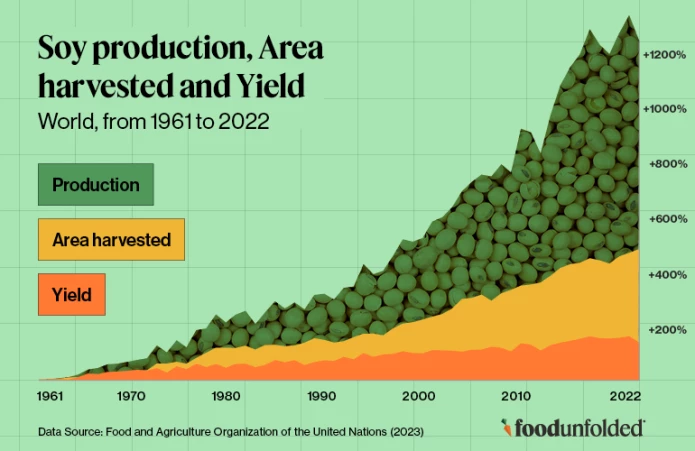 Then, in 1996, there was a big breakthrough: genetically modified (GM) soy that could tolerate glyphosate, a weed killer. This meant farmers could spray their fields to kill weeds without harming the soy plants. This made it easier to grow soy in even larger quantities because farmers didn’t have to remove weeds mechanically. The late 1990s ban on bone meal following the “mad cow disease” outbreak further increased demand for soy as an alternative protein source.3,4