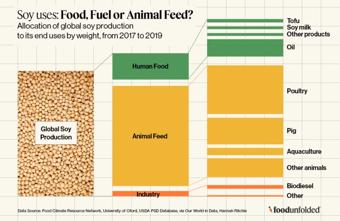 Have you ever wondered how much soy you really consume? It might surprise you to learn that most of it isn’t on your plate but hidden in the food chain. Nearly 80% of the world’s soybeans are used to feed farm animals, which means they’re fueling the production of beef, chicken, eggs, and dairy products like milk and cheese. Soy also finds its way into unexpected places, with soybean oil in everyday items like margarine, baked goods, chocolate, and even cosmetics.1
