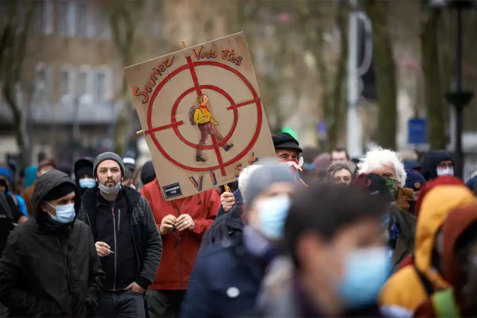 A man walks with a placard depicting a target with a hiker and reading 'smile, you're targeted’, two months after the killing of a young man by a hunter in the Pyrenees, 2020. The protesters demand better regulations of hunting, and a better safety for hikers and cyclists. Photo via Getty.