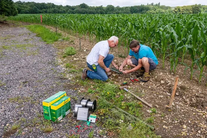 Installation of an electric fence to protect a field of corn against wild boars. Photo via Getty.
