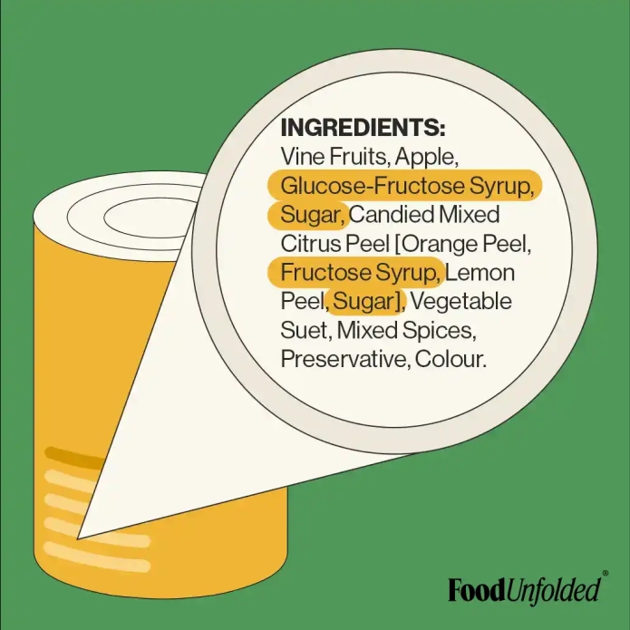 Sugars can sometimes be hard to spot in ingredients lists. Here it is split into several aliases (highlighted in yellow).