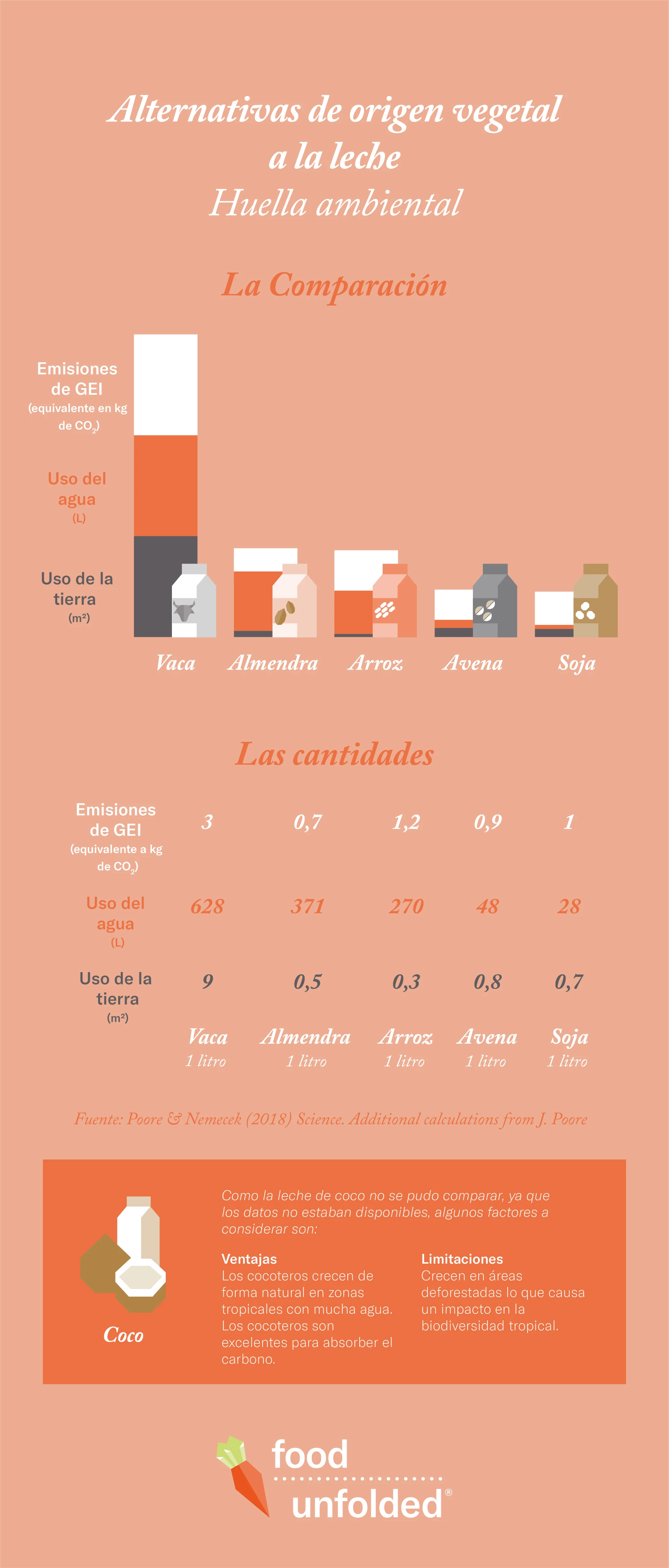 Si crees que todas las alternativas a la leche son igualmente sostenibles, puede que tenga que decepcionarte. Joseph Poore echó un vistazo más de cerca y comparó cuatro alternativas de leche de origen vegetal, 2 y nosotros hemos incorporado información de otro favorito de los consumidores: la “leche” de coco. Aquí hay un resumen de los pros y los contras medioambientales de las cinco alternativas lácteas más comunes: