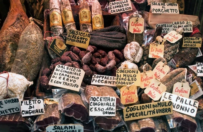 Salumi, sasiccia, prosciutto, all types of cured meat in Orvieto market, in Umbria, Italia. © 2013, Michelle R. Lee CC BY-NC-ND 2.0