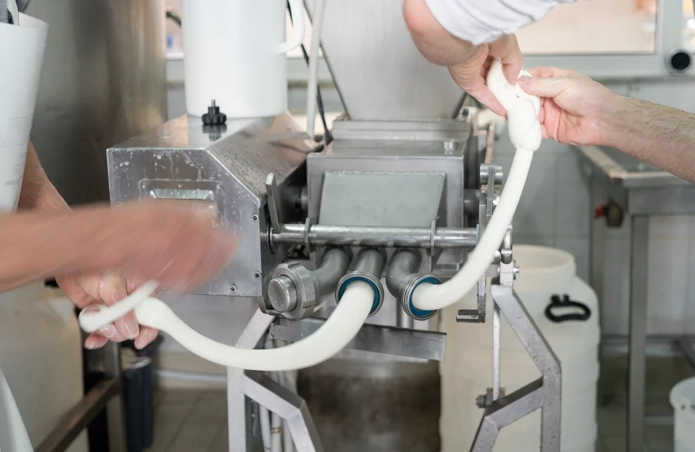 - Companies follow a similar process for making the cheese, but use large machines to stretch and produce the cheese.