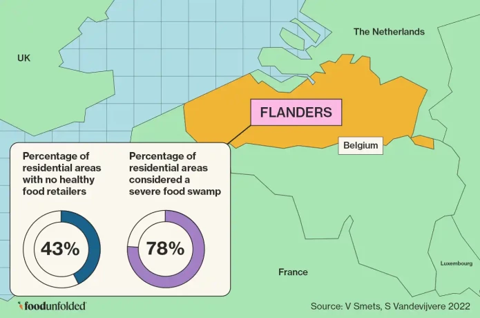 However, obesity is not an infectious disease or some novel virus. It’s the inevitable result of a food system strongly encouraging unhealthy eating habits. Let’s take a look at the situation in Flanders, the Dutch-speaking part of Belgium with a population of almost 7 million, and where I’m writing this article from. According to a study done by Sciensano, the Belgian research institute of National Public Health and Animal Welfare, 88% of Flemings live in a so-called ‘food swamp’, an area with more unhealthy than healthy retailers.1