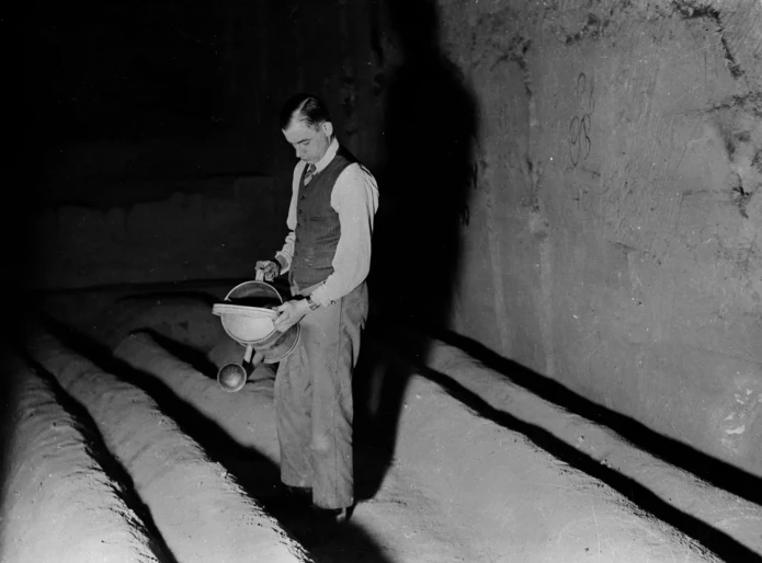 While this continued through the 19th century, in 1820 another industry was born in the catacombs; mushroom farming. The constant temperature, humidity and darkness of the quarries were ideal growing conditions for growing fungi, which grew on rows of nutrient rich horse manure. Quarrymen became farmers, and they cultivated a button mushroom that became famous well beyond the city limits; les Champignons de Paris.2 At the height of the industry, there were estimated to be around 2000 farmers working below the city’s streets.3