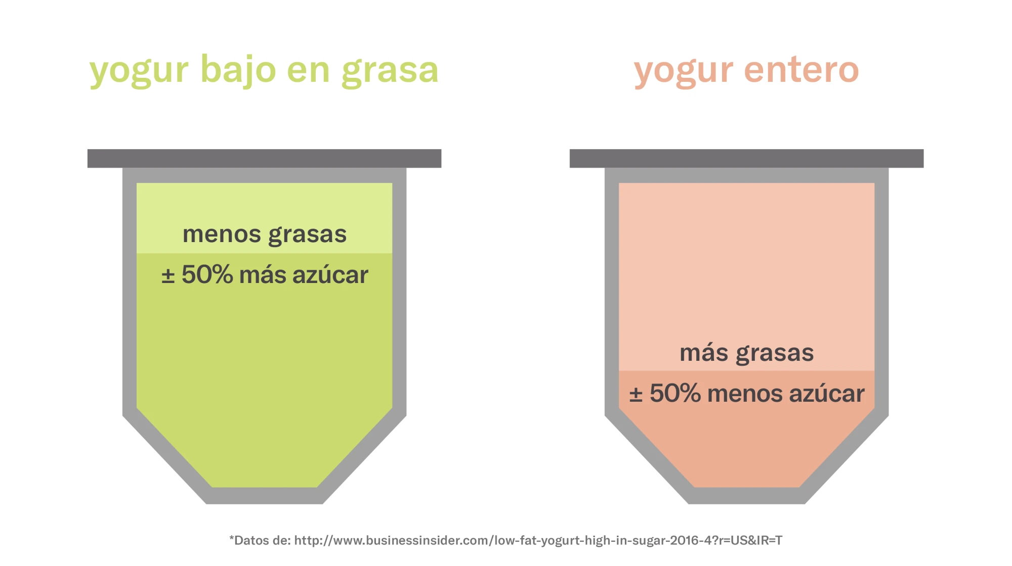 Si bien muchos investigadores aún están estudiando la paradoja de los lácteos enteros, sabemos que las grasas dan a los productos alimenticios su sabor y textura. Por lo tanto, al eliminar las grasas, los fabricantes se enfrentan al desafío de crear productos alimenticios con un bajo contenido en grasa. Al final, se añaden más azúcares y edulcorantes al producto para compensar el sabor (¡aunque la cantidad de calorías en el producto final puede ser más baja que la alternativa con toda la grasa!). Pero no lo olvides, incluso si sigues una dieta baja en grasas, tu cuerpo aún necesita grasas, y las grasas en el yogur pueden ser buenas para ti. Pero si consideras reducir el consumo de grasas de tu dieta puedes optar por alimentos naturalmente bajos en grasas.