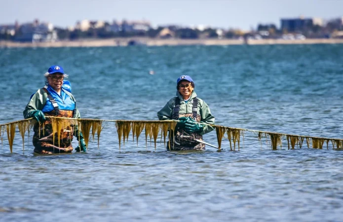 Members of the Shinnecock Indian Nation leverage traditional kelp farming techniques to help manage the negative impact of climate change at their farm in Hampton Bays, New York. (J. Conrad Williams Jr. via Getty Images)