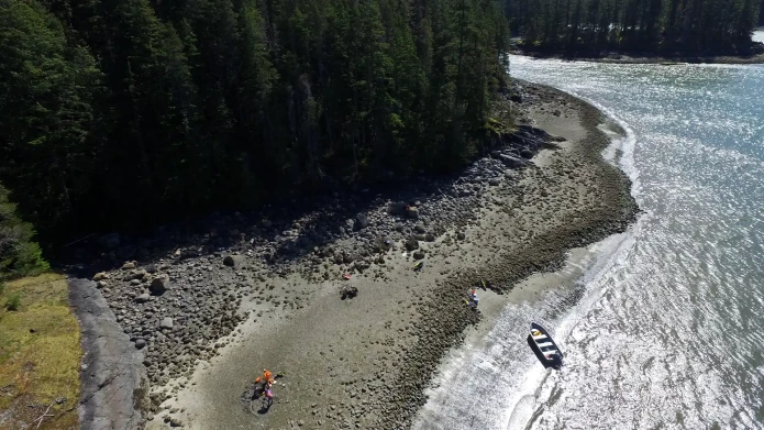 A team of archaeologists, lead by Dr. Dana Lepofsky, collecting samples in order to date indigenous rock walls. Quadra Island, British Colombia. Photos by Keith Holmes, Hakai Institute.
