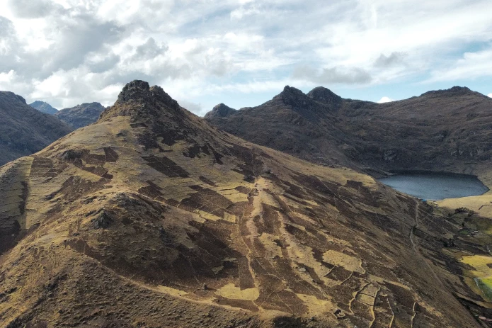 Aerial view of potato plots and the Laguna Azul (Blue Lagoon). (Photo by Leonardo Fernandez/Getty Images)
