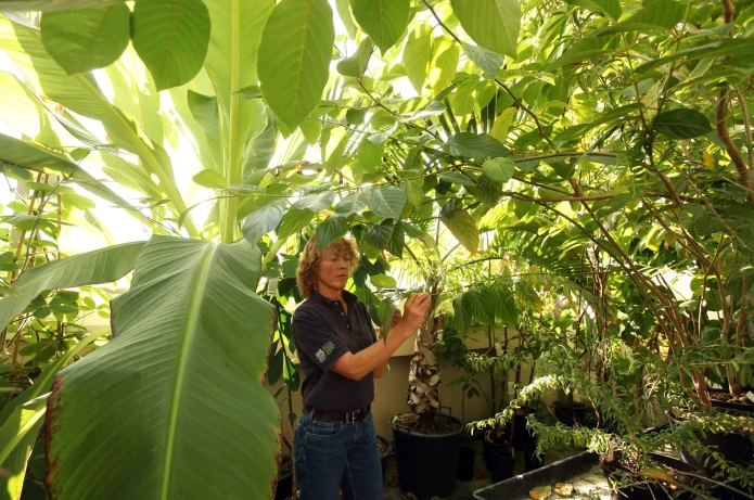 Jo Walmisley, a Higher Botanical Horticulturist, examines the plants in the wet, tropical glasshouse at Kew's Millennium Seed Bank. (Photo by Oli Scarff/Getty Images)
