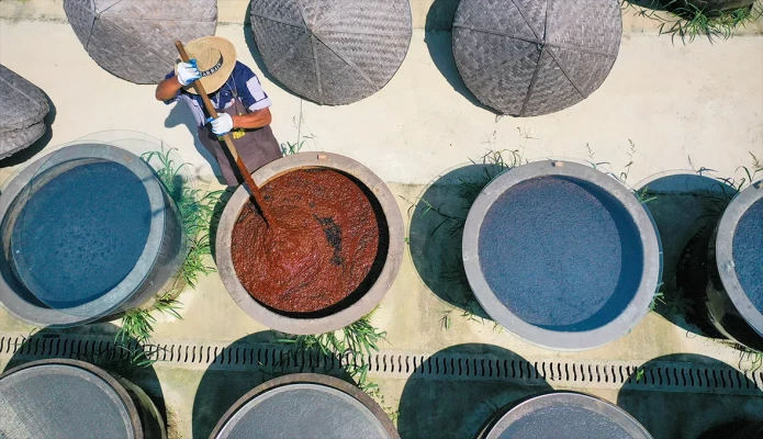 Aerial view of workers stirring soy sauce in the traditional jars at a drying yard on July 21, 2024 in Rugao, Nantong City, Jiangsu Province of China. (Photo by Xu Hui/VCG via Getty Images)