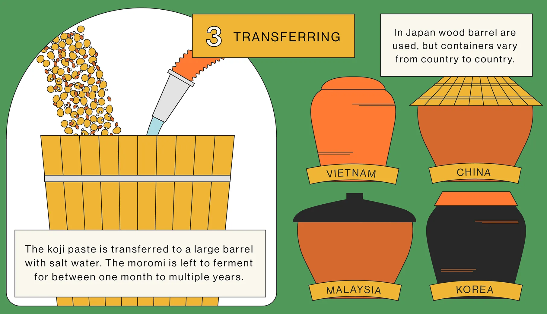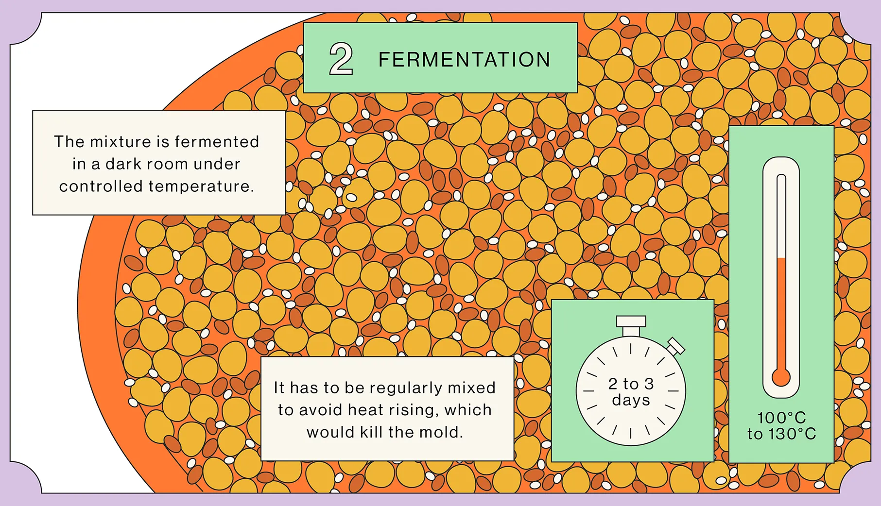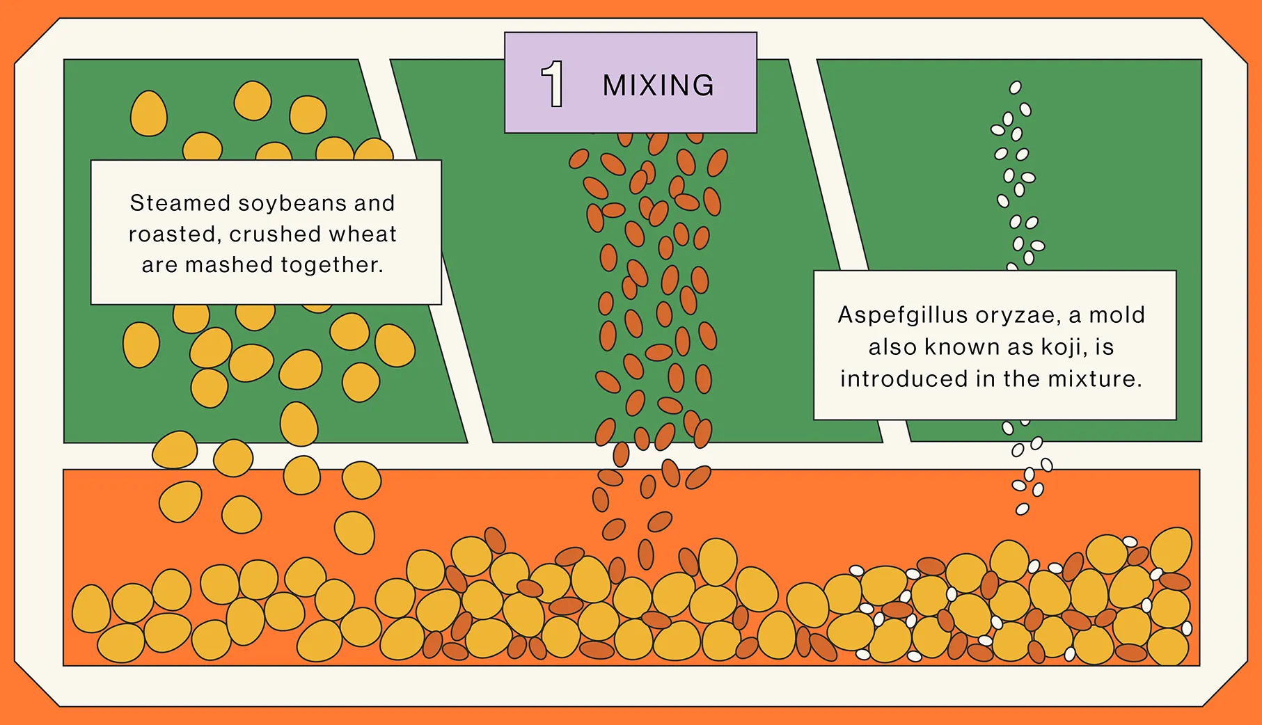 At the start of the process, soybeans are steamed, and wheat is roasted and then crushed before both are mashed together. This mixture is then inoculated with a specific strain of mould, usually Aspergillus oryzae or Aspergillus sojae, to enable fermentation. At this point, it forms a mash called a koji.4