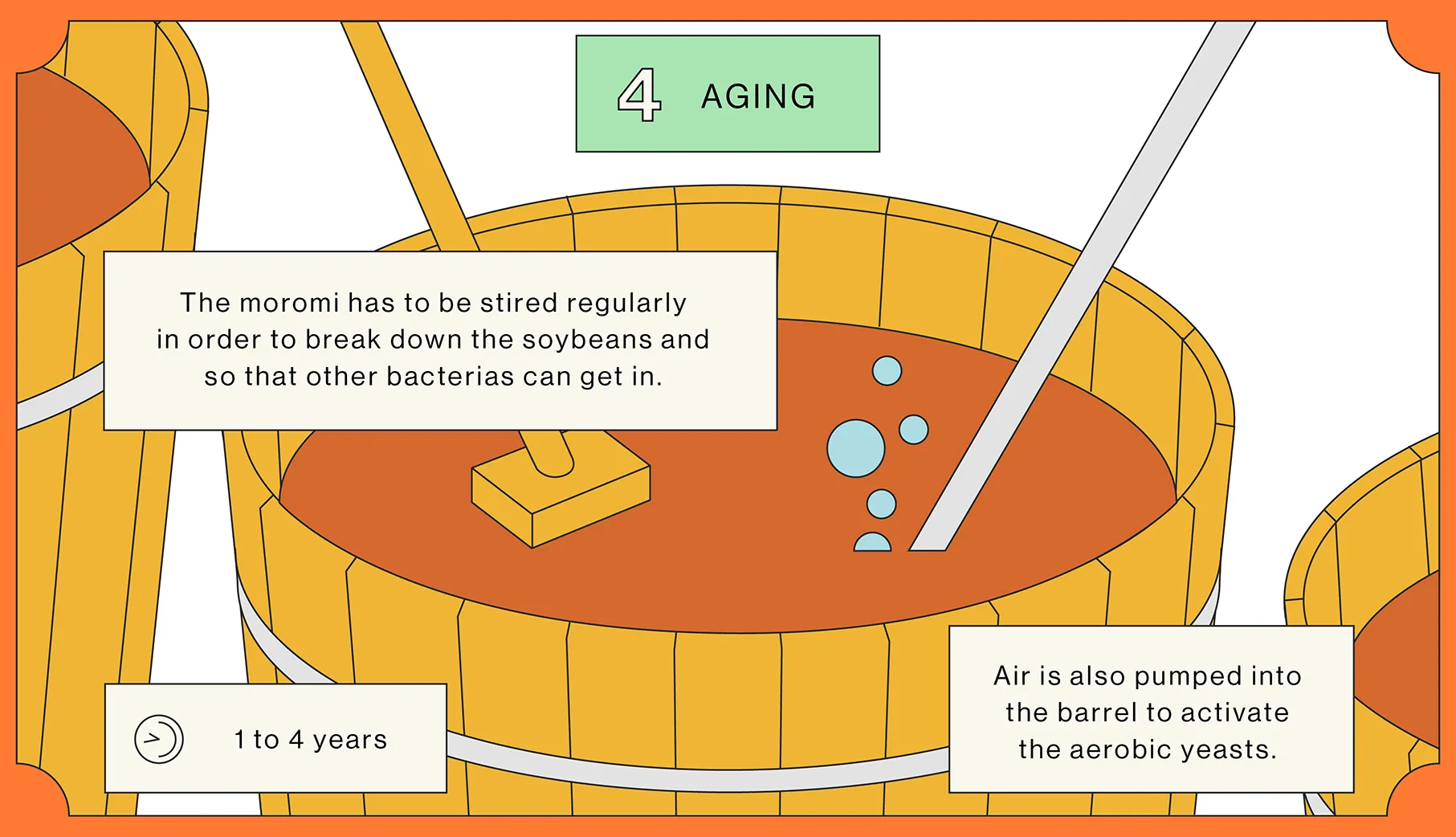 The next stage is brine fermentation. Here salt and water are added to what was the koji, to make a mixture called moromi. A starter culture is also mixed into the moromi to introduce strains of lactic acid bacterium and yeast that will kickstart the second stage of fermentation.8