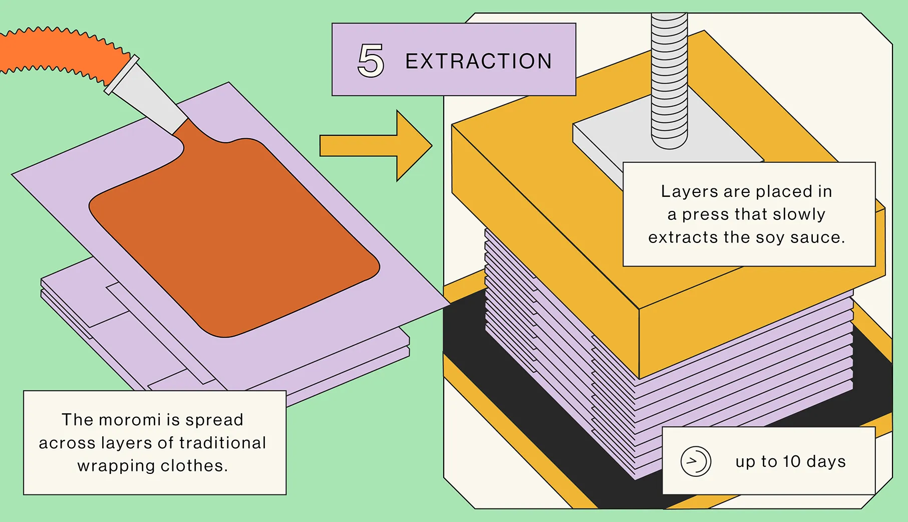 After months or years of fermenting, the final moromi becomes a thick gooey texture with the pungent, yeasty aroma typical of fermented foods. It is then time to refine the soy sauce by pressing layers of moromi in cloth-lined containers to extract the raw soy sauce from the solid mash. The raw soy sauce is then pasteurised by heating it to a high temperature before it is bottled and ready for consumption.