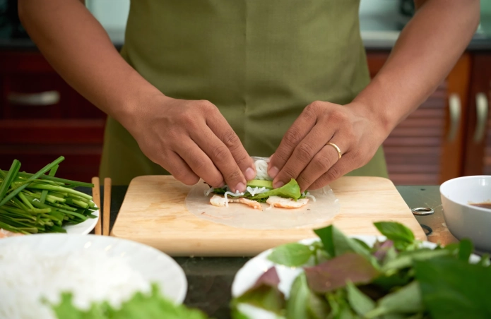- Layer the ingredients on top of the softened rice paper. Typical fillings include lettuce, thin strips of carrot, cucumber, mango, fresh dill, pre-cooked shrimp, and vermicelli rice noodles.