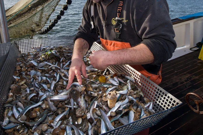 A fisherman sorts out the bycatch from shrimp fishing in the North Sea, Germany. Photo via Getty.