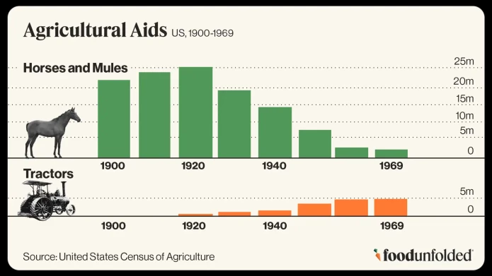 When tractors first appeared on farms in the late 1800s, their main appeal was replacing draft animals like horses and mules, which required land and resources for food and upkeep.