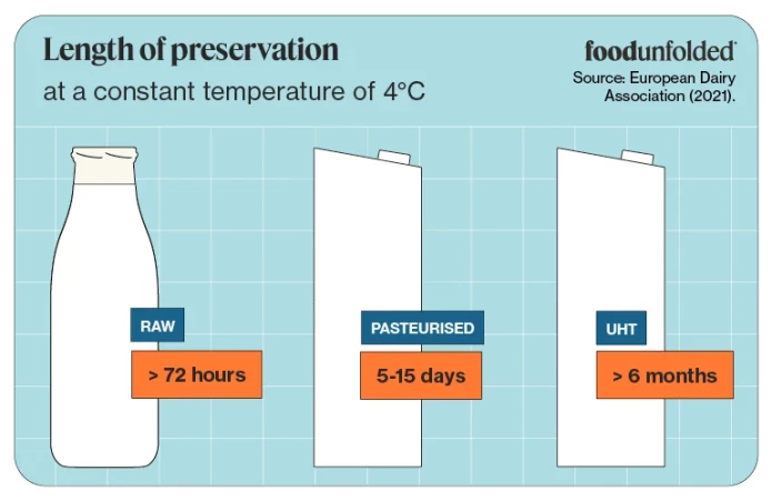 Raw milk skips pasteurisation altogether, and is instead bottled and refrigerated straight from the udder. This reduces shelf life significantly and increases the risk of milk borne illnesses if the raw milk is contaminated with pathogens.1