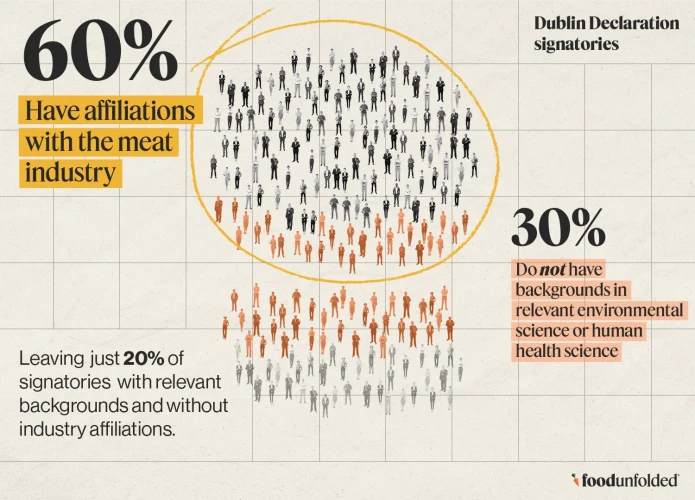 However, more than one thousand scientists have decided to sign this declaration. And so we thought it would be reasonable to check how many of them have relationships with the meat industry. We were curious about the extent of the conflict of interest among the signatories. Based on previous research into the impact of affiliated research, our theory was that if a scientist has affiliations with the industry, it’s more likely they will decide to sign a document of this sort. With affiliations, we mean that their research has received any funding from the livestock industry over the past five years or that they held positions such as chair, advisor, consultant, or any other influential roles within industry associations. Our research showed that 60% of the signatories have affiliations with the livestock industry.