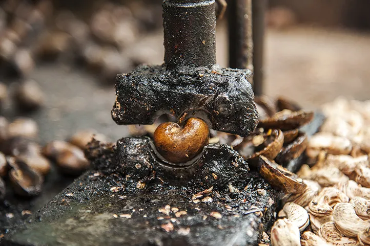 El paso más difícil en el tratamiento de los anacardos es la extracción de la nuez (con forma de haba) de su cáscara; lo anterior implica un trabajo intenso que requiere mano de obra especializada. El 90% de esta mano de obra son mujeres, quienes reciben salarios insignificantes. Cuando la cáscara se abre, rezuma un aceite denominado CNSL, o 'líquido de cáscara de anacardo', el cual es altamente corrosivo. Este aceite, cuando entra en contacto con la piel, provoca quemaduras y llagas que a menudo presentan riesgos para la salud de los trabajadores.9